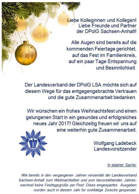 23. Dezember 2016 Auf Facebook teilenAuf X weitersagenArtikel versendenGrüße des LandesvorstandesDie besten Wünsche zum Weihnachtsfest und zum JahreswechselDer Landesverband der DPolG LSA möchte sich auf diesem Wege für das entgegengebrachte Vertrauen und für die gute Zusammenarbeit bedanken. Zugehörige Dateien Weihnachtsgrüße 2016 80 KB